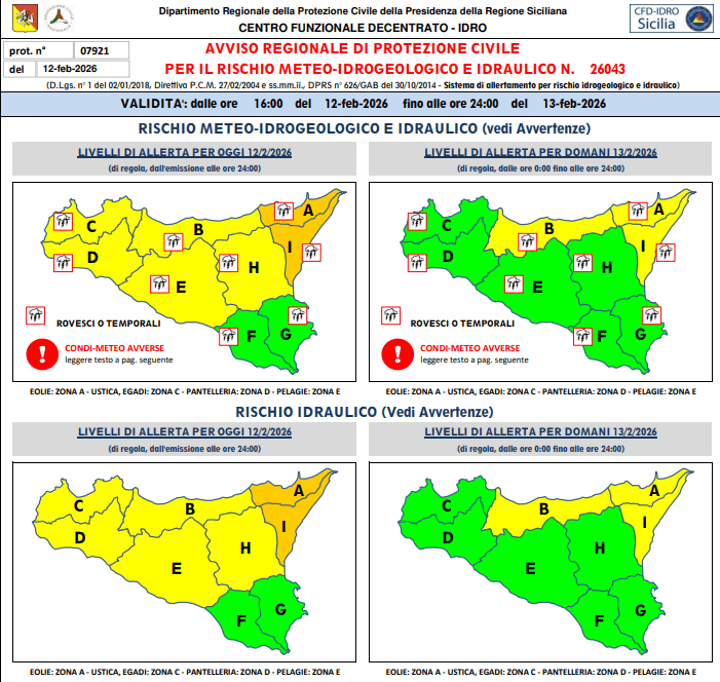 Allerta gialla per rischio meteo-idrogeologico nel Comune di Palermo fino al 12 febbraio 2026 Redazione | 11 Febbraio 2026 Allerta gialla per rischio meteo a Palermo! ⚠️ Preparati a condizioni avverse dalle 16:00 di oggi fino a domani sera. Rimanete informati! 🌧️