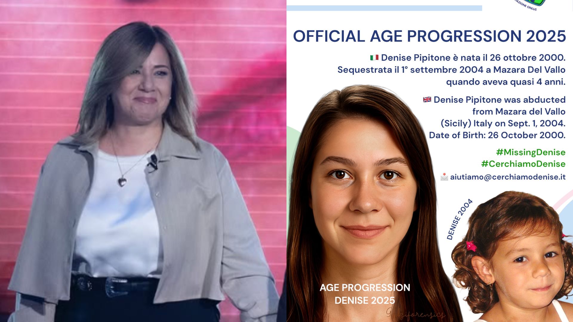 Nel corso della trasmissione, sono state presentate le nuove immagini di ‘age progression’, realizzate dalla dott.ssa Paloma Joana Galzi, un’esperta in Forensic Imaging. Le ricostruzioni digitali offrono un’idea di come potrebbe apparire Denise oggi, all’età di 25 anni. “Noi Denise ce la immaginiamo proprio così”, hanno dichiarato commossi i genitori.